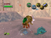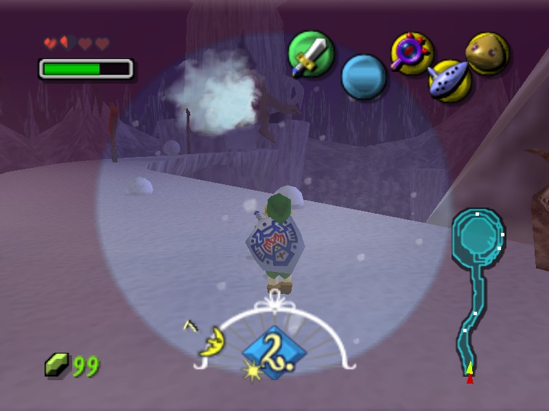 Also ab gen Norden zum Bergpfad. Erst den Graben mit den Dodongos durchlaufen und ein wenig links die Rampe zum Pfad hochgehen. Zwei gezielte Pfeile auf den hängenden Eiszapfen bringen