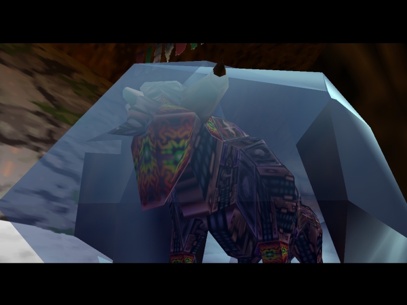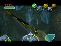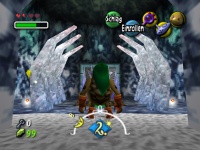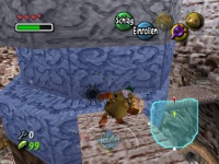 herunterschießen sollst. Diese zerstören die Eisblöcke und geben Dir den Weg frei, so dass Du über die Sockel zum großen Schneeball springen kannst. Den mit dem Goronenschlag zerkleinern