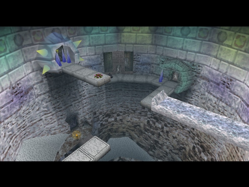 schmelzen und dann den vereisten Augenschalter aktivieren. Das Podest fährt empor und Du kannst auf die obere Kante springen. Ein Blick mit dem Auge der Wahrheit zeigt Dir links oben