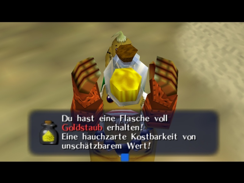 Eine wichtige Nebenaufgabe kannst Du noch angehen, bevor es weitergeht, da Du endlich auf Epona reiten kannst. Kaufe zunächst im Basar das rote Elixier, schnapp Dir Dein Fohlen und reite