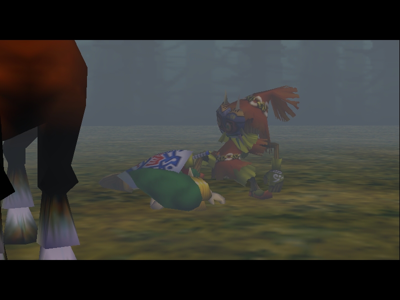 Horror Kid mit seltsamer Maske aus dem Nebel auf. Ohne Skrupel filzt er Dich nach wertvollen Sachen und klaut die Okarina der Zeit. Während Du benommen aufwachst,